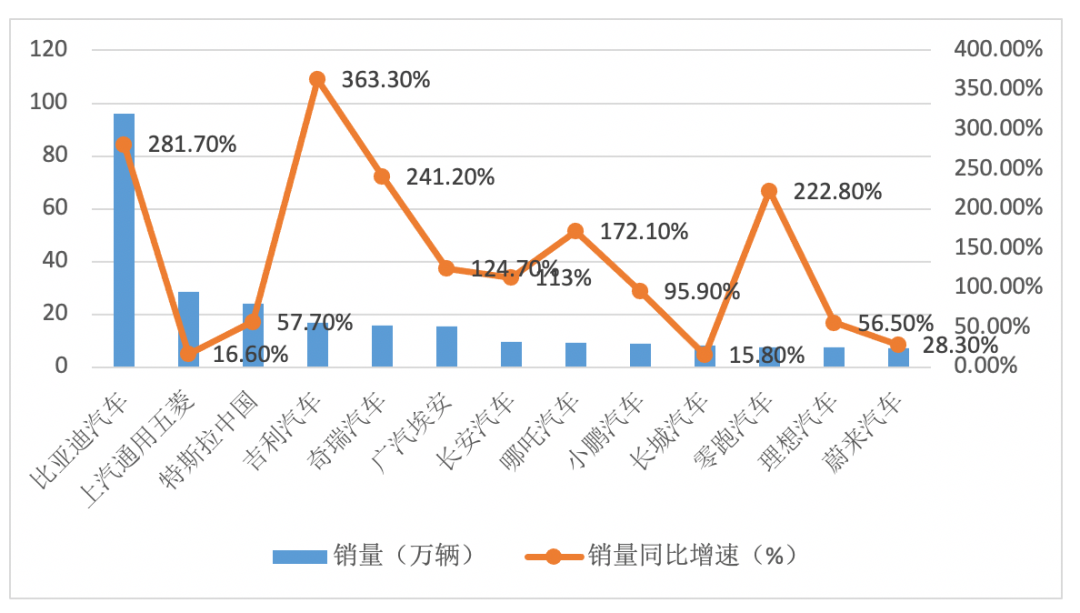 2022年1—8月新能源厂商销量排行情况(万辆、%)