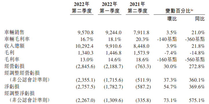 数据显示,2022年第二季度,蔚来净亏27.58亿元,经调整净亏损(非公认会计准则)22.67亿元,较上年同期亏损拉大369.6%、近6倍,环比扩大逾五成、逾七成。上半年,该公司净亏45.40亿元、经调整净亏35.77亿元,亏损同比拉大3.37倍、4.18倍。公司二季度、上半年的毛利率同比减少5.6个、5.24个百分点。