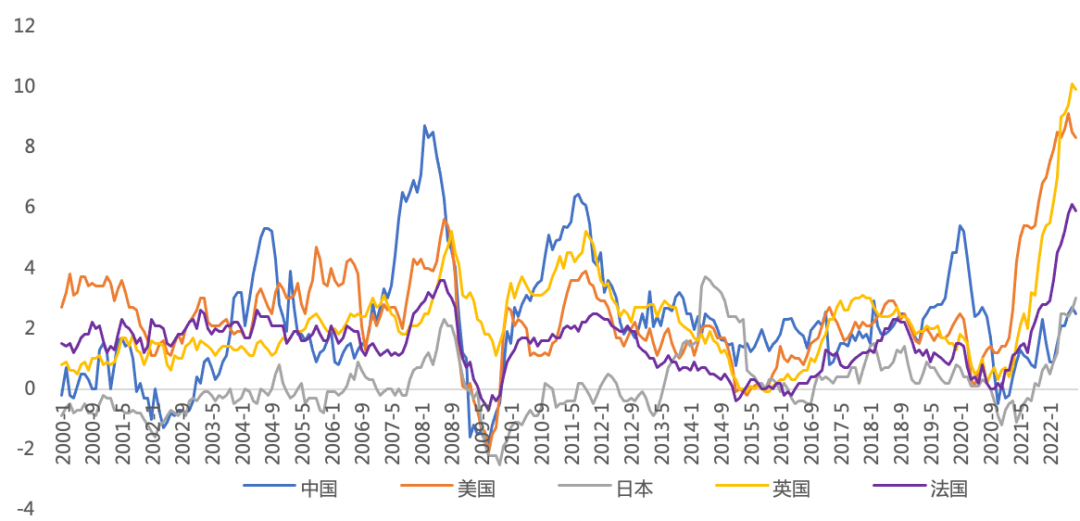 原料和能源价格的大幅上涨,导致企业生产和采购成本大幅上升,进而导致生活必需品普遍上涨,通胀压力增大。从中国、美国、日本、英国、法国的CPI增速来看,英国和美国的CPI自2021年开始增长迅速,打破了近40年以来的记录。