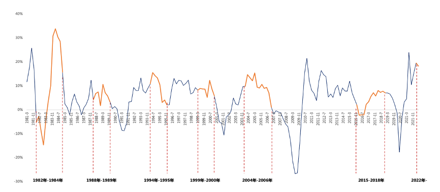 图5 1981-2023年美国GDP增速和加息周期(季度数据)