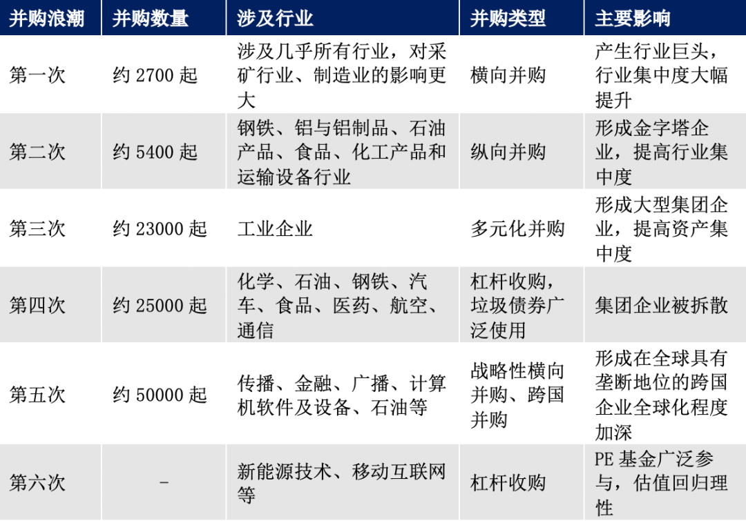 从美国历次并购浪潮来看,主要受以下因素的影响:经济周期、产业环境、资本市场环境及法律监管环境。其中,美国的六并购浪潮均是发生在流动性充裕,金融市场繁荣的背景下,在查尔斯•盖斯特的《百年并购》中引用了《华尔街杂志》的一句话,“过去的历史清楚地说明了这样一个特别的事实:兼并活动在很大程度上是由好年景,特别是股票的牛市驱动;而在经济不景气时兼并数量会出现大幅下降。”从美国百年并购历史来看,在经济不断复苏甚至高涨,快速上涨和流动性充裕的情况下,企业家往往对于未来抱有更乐观的态度,对于潜在的风险意识不足,企业在市场投资和决策过程中往往会过于冒险。随着流动性收缩,金融市场降温往往伴随着并购浪潮的终结,如1929年股市崩溃、2002年互联网破灭都直接导致了并购活动的急剧收缩。经过盲目扩张和并购,当经济开始下行,市场需求缩减,可能会面临剥离和破产重整的问题。