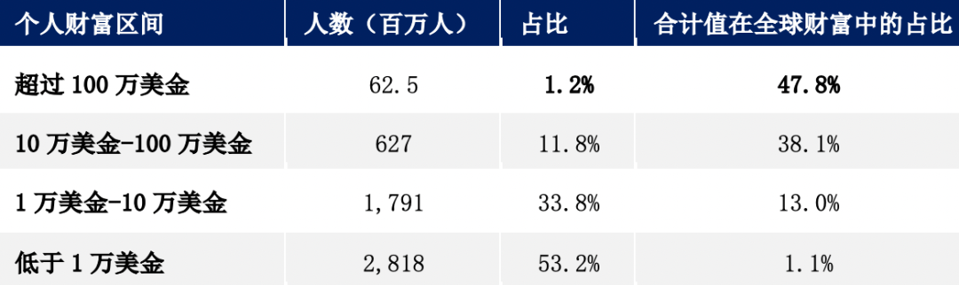 2018年,全球最富有的1%人口掌握了45%的财富,全球最富有的10%人口占有财富总量的82%,而全球最不富裕的50%人口占有的财富总量不足全球的1%。2021年,全球超高净值人群的数量增加了4.6万人,达到26.42万人。站在全球财富金字塔尖的百万富翁财富占比连续第二年上升,百万富翁总人数占全球总人数1.2%,所拥有的全部财富占全球财富进一步提升到47.8%。