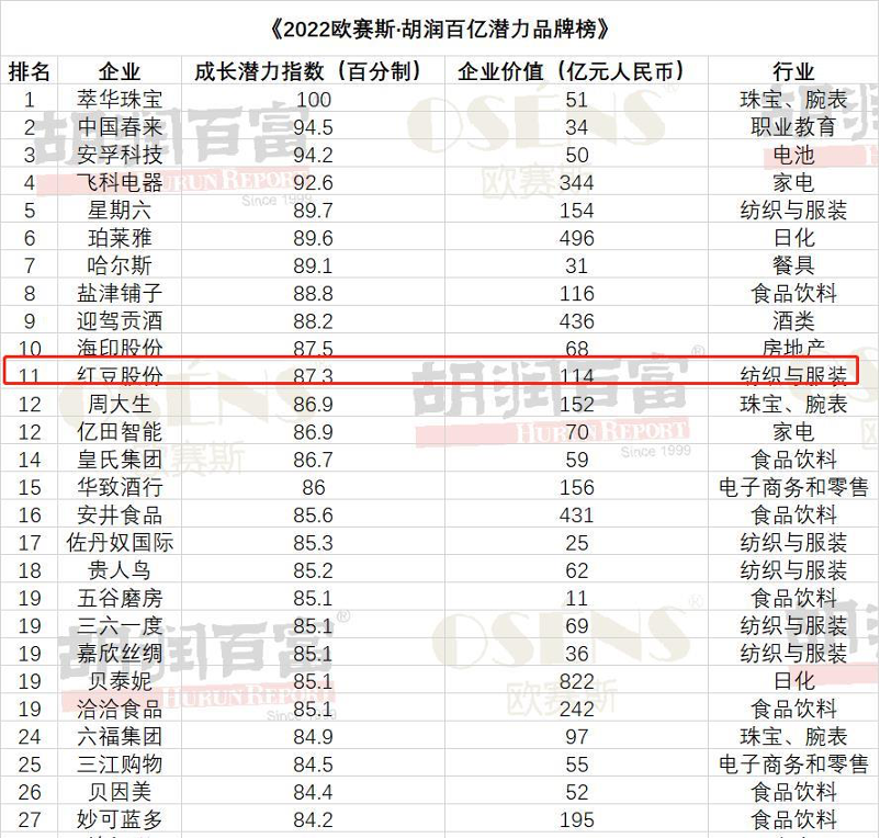 日前,胡润研究院发布《2022胡润百亿潜力品牌榜》,100家最具成长潜力的中国本土企业上榜。战略转型蜕变的红豆股份(600400.SH)首次上榜,位列“百亿潜力品牌榜”第11名及“价值增长领先企业”Top前10。据悉,榜单按照企业“成长潜力指数”排名,参考企业2022年的营收增速和市值增速两个维度给出综合评分。营收增速是企业2022年上半年的营收相对于去年同期的增速,市值增速是企业2022年7月29日的市值相对于去年同期的增速。