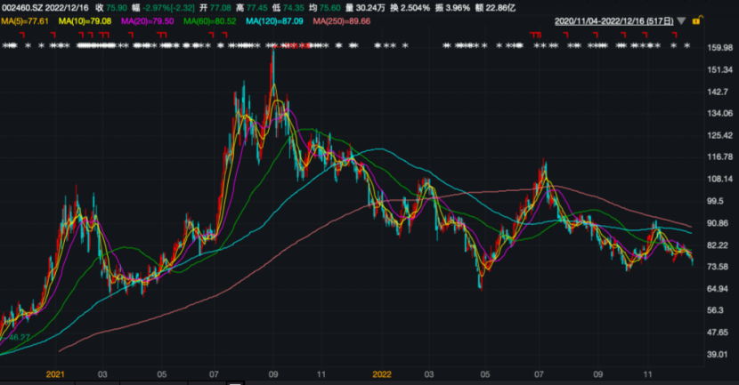 资本市场方面,近一年多来,赣锋锂业的表现也不够理想。A股市场方面,自2021年9月初达到160.07元/股(按前复权计算)高点后,该公司股价便总体陷入震荡下跌态势,截至今年12月16日收盘,每股仅报收于75.9元,距离此前高点已降超五成。
