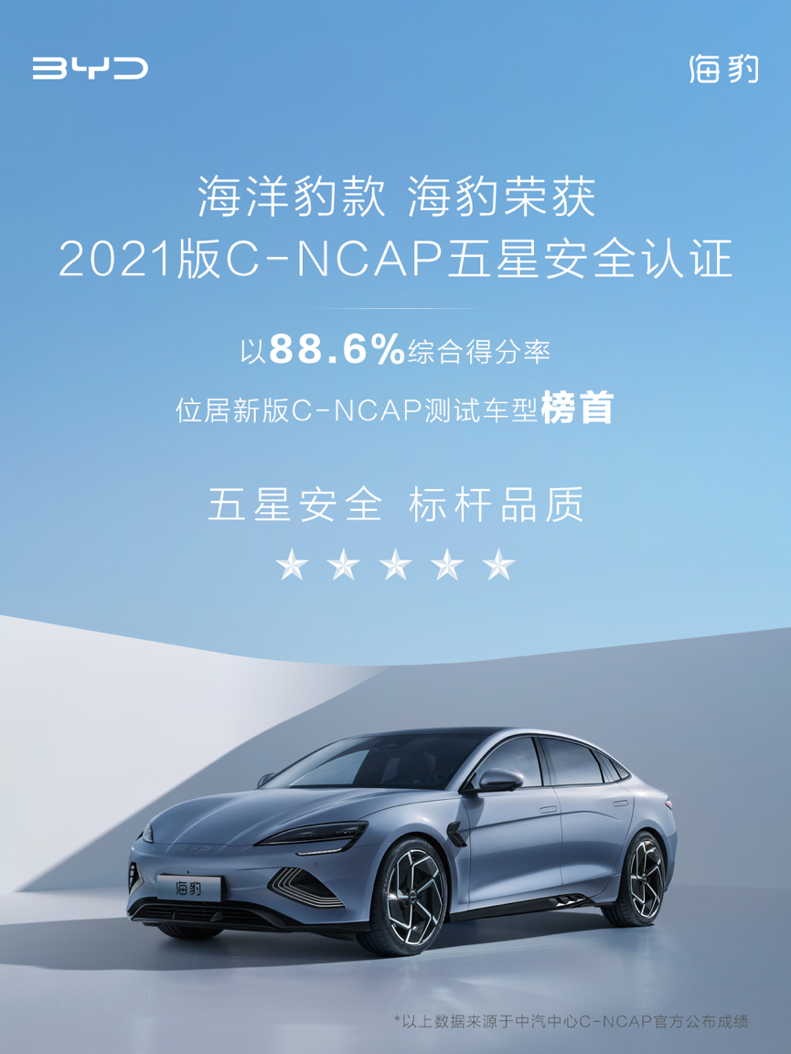 1月16日,“中汽中心”发布了最新批次的C-NCAP安全碰撞测试成绩,比亚迪海豹以88.6 %的综合得分率荣膺五星安全评价,并通过了“电安全”评价。这是海洋“豹”款海豹上市以来,首个来自第三方权威机构的硬核背书,再次印证海豹的安全性。自《C-NCAP管理规则》(2021年版)实施以来,海豹车型的综合得分率位列总榜单第一名。