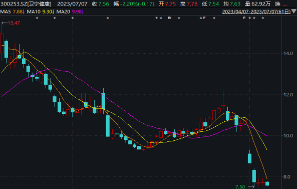 5日,卫宁健康披露周炜被留置原因为涉嫌行贿罪;同时公司公告称,由副董事长刘宁代为履行董事长、法定代表人职务。受消息影响,该公司股价在7月3日、4日连挫两天,累计下跌三成;截至7日收盘,卫宁健康股价已下挫至7.56元/股(不复权,下同),五个交易日市值缩水70亿。