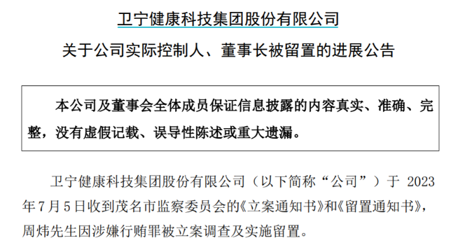 根据公告,卫宁健康于7月5日收到茂名市监察委员会的《立案通知书》、《留置通知书》,公司实控人、董事长周炜因涉嫌行贿罪被立案调查及实施留置。此前在7月3日,公司公告称周炜被实施留置措施,不仅引发业界广泛关注,且已有猜测被留置原因或与医药反腐有关。