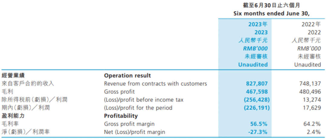 雍禾医疗2023年上半年及2022年上半年财务概要(千元)