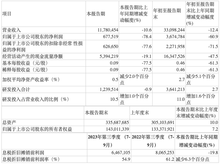 从单季财务表现来看,该公司第三季度收入实现117.80亿元,同比下滑10.56%,环比增长6.04%;归母净利润实现6.78亿元,同比下滑78.41%,环比减少51.78%;单季度扣非净利润为6.27亿元,同比下滑77.61%,环比下滑18.47%;毛利率为24.05%,环比增长1.91个百分点,净利率为9.55%。