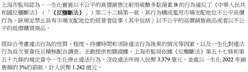 《行政处罚决定书》显示,由于涉嫌违反《反垄断法》相关规定,上海市市场监督管理局责令上海医药全资子公司一生化停止违法行为。同时,一生化还领到一张4.62亿元的罚单。其中,约3.38亿元为一生化上述行为的违法所得,因而被上海市市场监督管理局没收;另有1.24亿元,为上海市市场监督管理局对一生化的罚款金额,占一生化2022年销售额的3%。