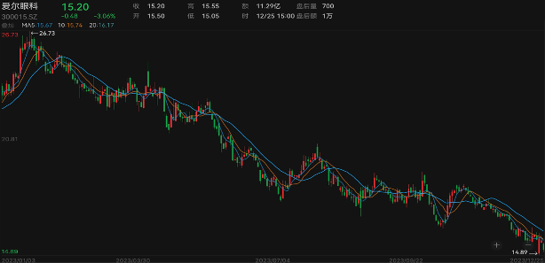 值得关注的是,2023年以来,尽管业绩表现较为理想,但该公司在二级市场的股价却持续下行。截至12月25日收盘,爱尔眼科股价为15.20元/股(前复权,下同),最新市值为1418亿元,年内已缩水约800亿元。