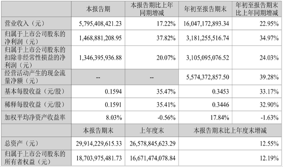 进入2023年,爱尔眼科的营收和净利润均实现双位数增长。财报显示,前三季度,该公司实现营业收入160.47亿元,同比增长22.95%;实现归母净利润31.81亿元,同比增长34.97%;实现扣非后净利润31.05亿元,同比增长24.03%。