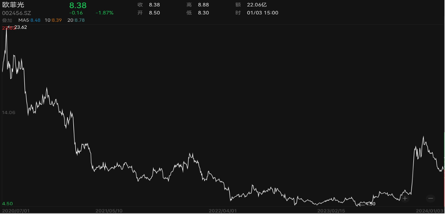 二级市场方面,受业绩不佳影响,欧菲光近年股价一路下行。2023年4月末,该公司股价跌至4.50元/股(以前复权计算),较2020年7月的23.62元/股高点已累计下挫超80%。直到2023年9月末,受公司摄像头模组进入华为手机Mate 60系列供应链消息影响,欧菲光股价开始大幅拉升。2023年11月初,该公司股价已较4月底时的低位回调约173%。截至2024年1月3日,欧菲光股价报收于8.38元/股,目前市值为273亿元。