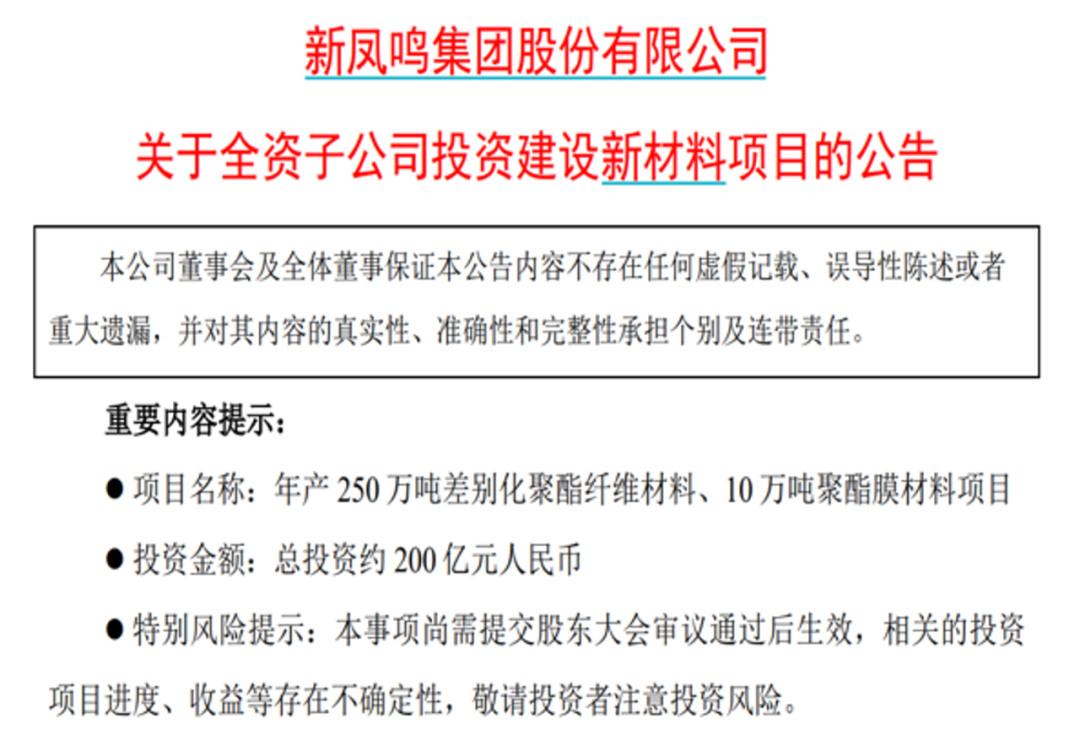 200亿元投资计划发布次日,新凤鸣又发布了一份补充公告,表示项目一期投资仅约35亿元