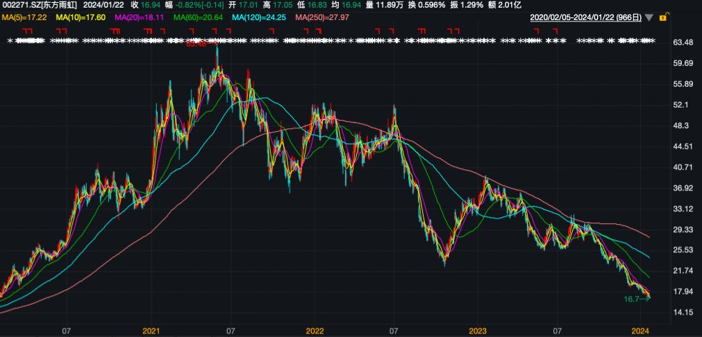 二级市场方面,东方雨虹股价自2021年6月后持续震荡下跌,并于2024年1月18日盘中一度跌至16.7元/股,创近四年新低。