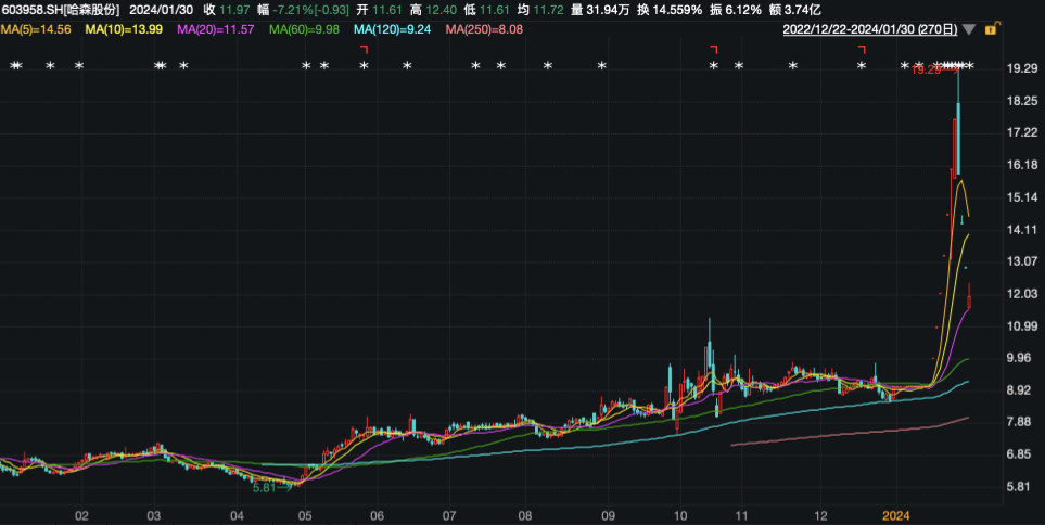 标点财经研究员注意到,哈森股份并未在交易预案中明确点出A公司具体为哪家企业。即便如此,复牌后,哈森股份在1月16日至1月24日连续7个交易日涨停,动态市盈率达-6022.02,该公司也多次发布股票交易风险提示公告和股票交易异常波动公告。