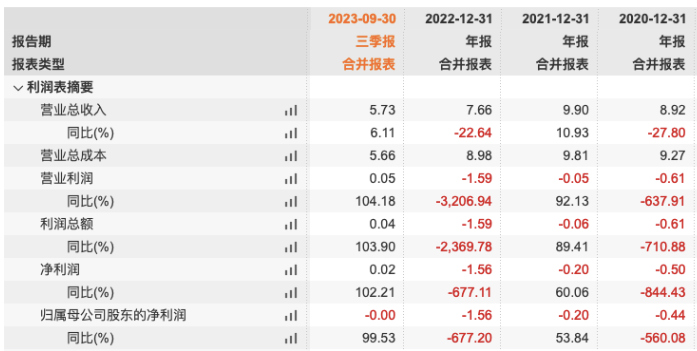 既往财报显示,2020年—2022年及2023年前三季度,哈森股份分别实现营业收入8.92亿元、9.90亿元、7.66亿元和5.73亿元,分别同比增长-27.80%、10.93%、-22.64%和6.11%;同期分别实现归母净利润-0.44亿元、-0.20亿元、-1.56亿元和-48.71万元,分别同比增长-560.08%、53.84%、-677.20%和99.53%。