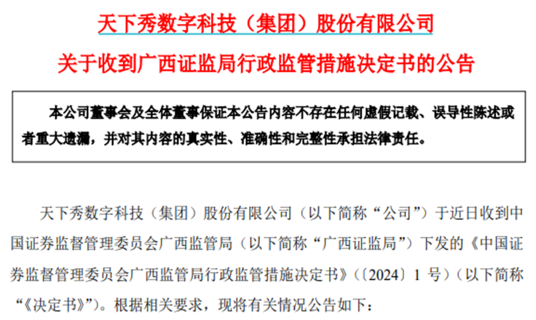 依据相关规定,广西证监局决定对天下秀采取责令改正的行政监管措施,并要求公司在收到决定书之日起30日内提交书面整改报告。