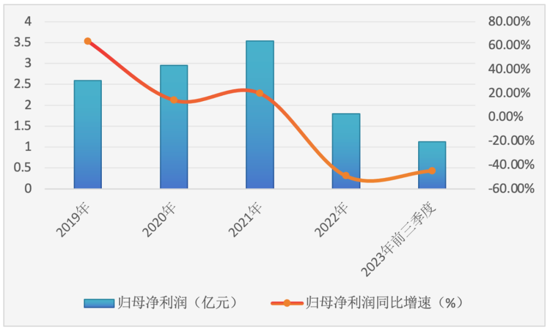 进入2022年,公司业绩出现下滑,营收同比下降8.48%至41.29亿元,归母净利润同比下滑近五成至1.80亿元;扣非后归母净利润则同比降幅超七成、至1.04亿元。公司解释称,主要是受市场环境波动影响,该年二季度至四季度业务节奏被打乱,业务执行端受到影响;同时基于业务快速成长及拓展,各项费用均有所增加,导致净利润下降。