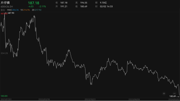此利好消息并未起到明显作用。截至1月31日收盘,片仔癀股价报于199.4元/股,跌幅为9.16%,单日市值缩水超120亿元。此后两个交易日,该公司股价依旧呈下跌趋势。2月2日盘中,片仔癀股价再创新低,最低跌至180.69元/股,这较该公司2021年7月21日触及的487.9元/股最高价已跌近63%。