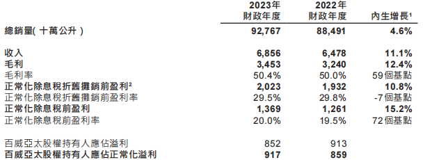 2023年百威亚太正常化除息税折旧摊销前盈利虽录得一成增长,但仍未达到此前几年高点