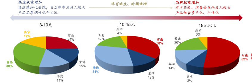 从竞争格局来看,8元—10元价格带作为6元的自然升级,企业竞争除了产品品质优化,更看重终端掌控力。15元以上超高档价格带,则在产品矩阵丰富的同时,需要持续投入赞助、举办大型活动等拉升品牌调性。当前,各价格带竞争表现层次分明,即百威培育超高端,华润借喜力占位高端,青啤以及燕京则享有次高端扩容红利。