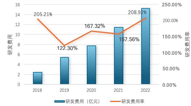 2018年以来,寒武纪研发投入逐年大幅增长;2020至2022年,各年度研发费用分别为7.68亿元、11.36亿元、15.23亿元,研发费用率分别为167.32%、157.56%、208.92%。