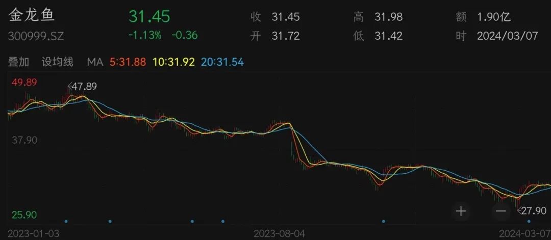 截至3月7日收盘,金龙鱼报收于31.45元/股,相较于曾触及的145.36元/股高点,跌超七成