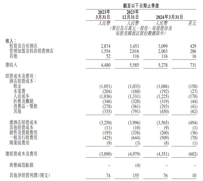 今年一季度,华住集团的酒店经营成本为35.65亿元,上年同期为32.50亿元,上季度为39.96亿元。华住集团表示,成本同比增长主要由于酒店网络扩展以及租赁酒店租金减免的减少,而成本的环比下降主要由于2023年第四季度物业及设备以及使用权资产录得3.62亿元的减值亏损,今年一季度则无该项减值亏损。