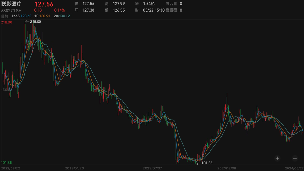 不到两个月时间,联影医疗盘中就触及历史最高价218元/股,市值接近1800亿元。但此后,该股就进入了漫长的下行区间。2023年8月22日,在上市一周年当天,该公司股价跌破发行价,创下上市以来单日最大跌幅,单日市值蒸发超130亿元。同年10月10日,联影医疗股价盘中触及101.36元/股历史低点。截至2024年5月24日,联影医疗报收于127.45元/股,较历史高点已跌超四成,市值为1050亿元。