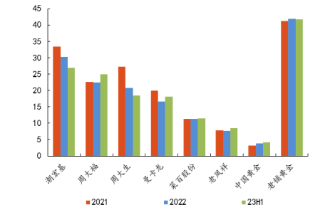 标点财经、投资时间网研究员注意到,基于消费者对产品设计、工艺技术、品牌内涵等的理解日益加深,在行业扩张过程中,金饰品牌的集中度逐渐提高,头部品牌对消费者的吸引力不断提升。2023年,中国古法黄金珠宝的市场中,来自五大黄金珠宝品牌所产生的古法黄金珠宝产品总收入约为724亿元,在整个市场中占有46.1%的份额,老铺黄金以2%的市场份额位列第七位。
