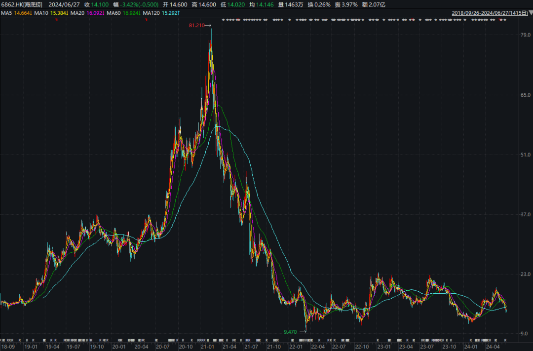 业绩不佳也反映在股价上。特海国际自上市后首先迎来一波股价上涨行情,并于2023年3月7日盘中触达24.30港元/股的历史最高点,但此后即震荡下行至今。截至6月27日收盘,特海国际报收于14.10港元/股,当前总市值为91.69亿港元。