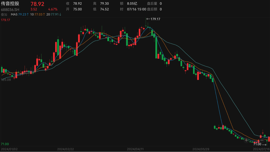 二级市场方面,或受业绩环比下降影响,今年一季报发布次日(4月25日),传音控股开盘后股价迅速走低,单日大跌10.88%,此后该股持续震荡下行至今。截至7月17日收盘,传音控股收报80.91元/股,这一价格较公司年内创下的179.17元/股高点下挫54.84%,最新市值为913.6亿元。