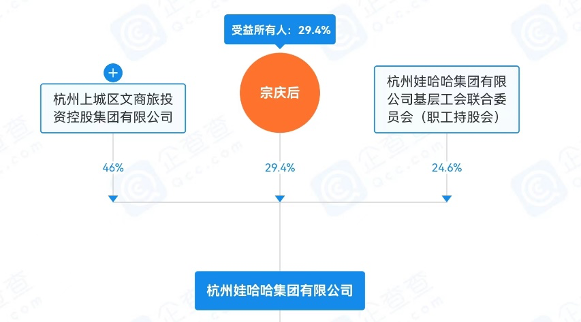 从股权结构来看,与市场普遍的印象不同,娃哈哈的第一大股东为杭州上城区文商旅投资控股集团有限公司(下称上城文商旅控股),持股46%。该公司由上城区国有资本运营集团有限公司100%控股,为杭州上城区国资实际控制。而作为公司创始人的宗庆后为第二大股东,持股29.4%。此外,娃哈哈基层工会联合委员会(职工持股会)持有公司剩余24.6%的股权。