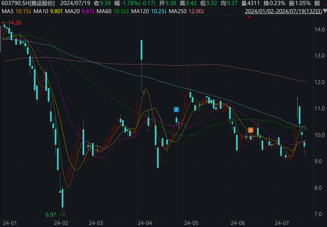 从二级市场来看,进入2024年后,雅运股份的股价走势持续呈现出显著不稳定性。年初时,该公司股价曾触及14.30元/股的阶段性高峰,但随后在短短一个多月里,这一势头急转直下,股价一路震荡下滑至6.94元/股,创下上市来历史新低。
