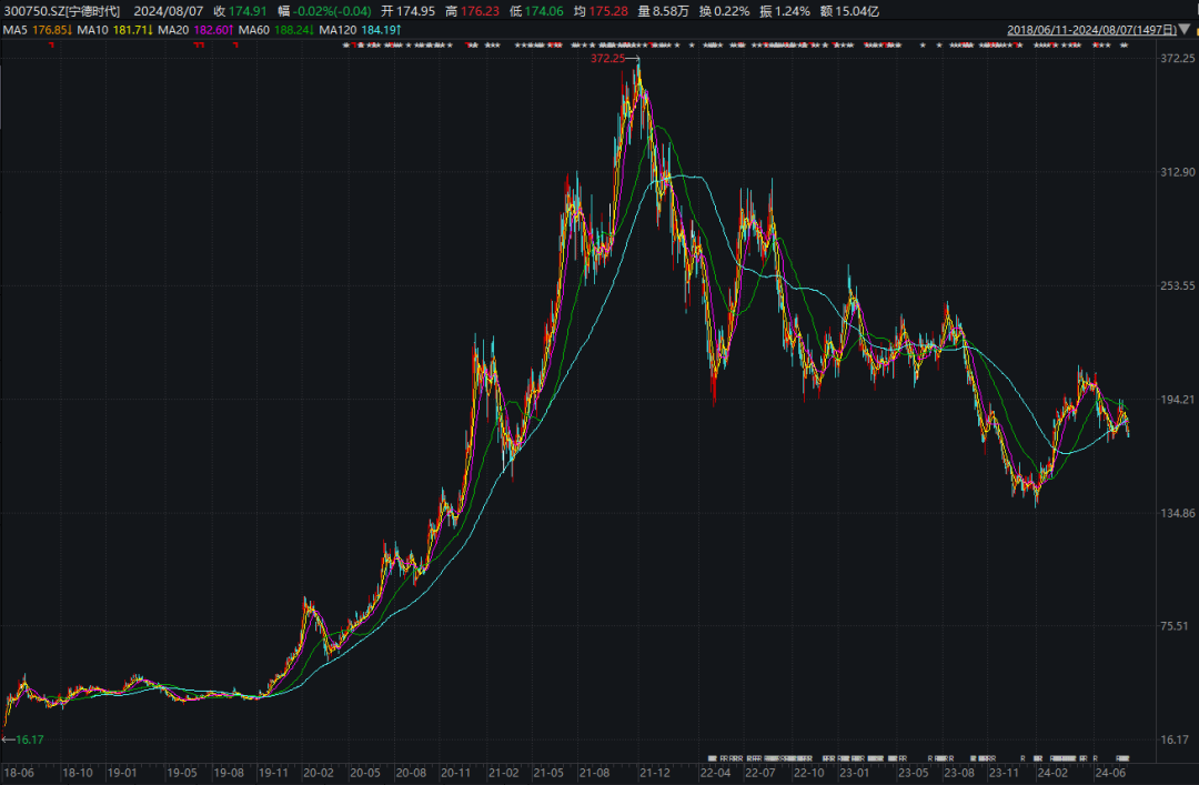 或受业绩不佳影响,7月29日周一开盘,宁德时代全天股价下跌2.55%,当日报收于184.53元/股。截至8月6日收盘,宁德时代报收于174.95元/股,较2021年12月3日盘中触达的372.25元/股的历史最高点下挫53.00%,跌幅超50%,当前总市值为7695.71亿元。