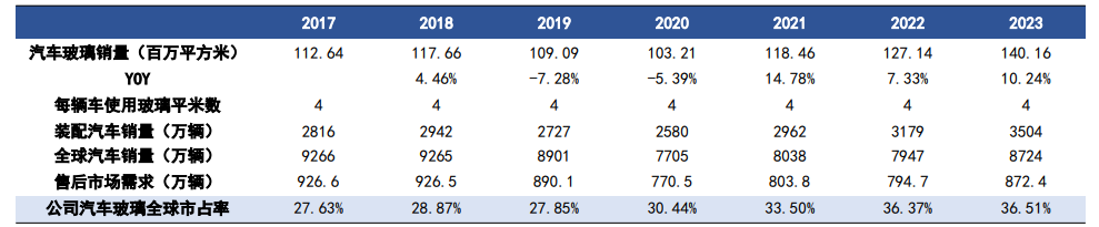 而伴随高附加值玻璃渗透,汽玻行业和公司的单车配套价值也有望持续增长。玻璃面积来看,特斯拉引领天幕玻璃趋势,该类产品显著提升单车玻璃面积,进而提高单车配套价值。据券商研报,当前单车玻璃平均用量已提升至3.9—4.5平方米左右,较20世纪50年代的汽玻用量提高1倍左右。福耀汽车玻璃单平方米价格也由2020年的174元提升至2023年的213元。
