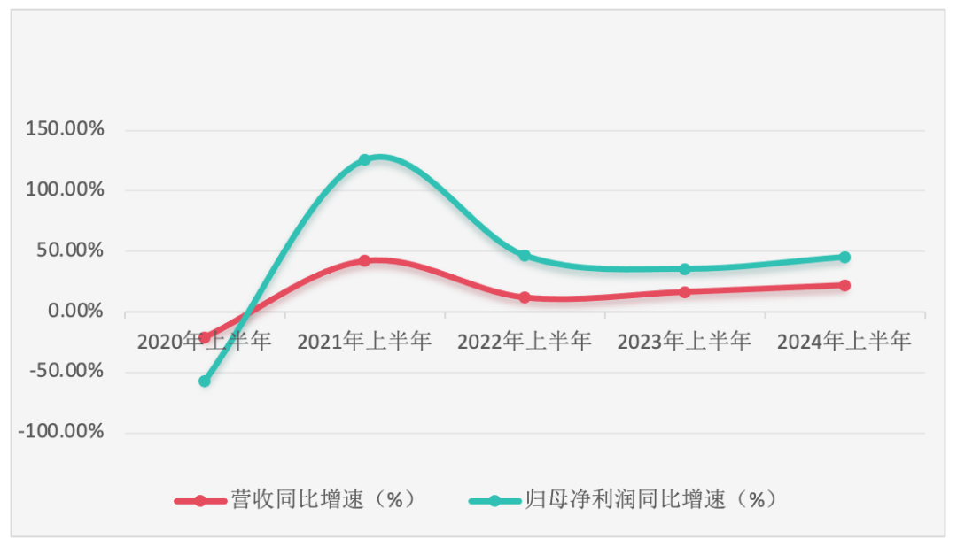 财报数据显示,2024年上半年,福耀玻璃实现营收183.40亿元,同比增长22.01%;实现利润总额41.25亿元,同比增长24.26%;实现归母净利润34.99亿元,同比增长23.35%。营收与利润继续保持自2021年以来同期“双位数”的增速。