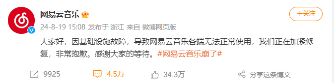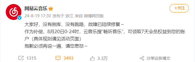 目前,网易主站和网易云音乐已恢复正常,网易云音乐发布微博强调“没有删库,没有跑路”“故障已陆续修复”。同时,网易云音乐还对用户发布了补偿方案,表示用户可于8月20日0—24时在APP中搜索“畅听音乐”领取7天会员权益。