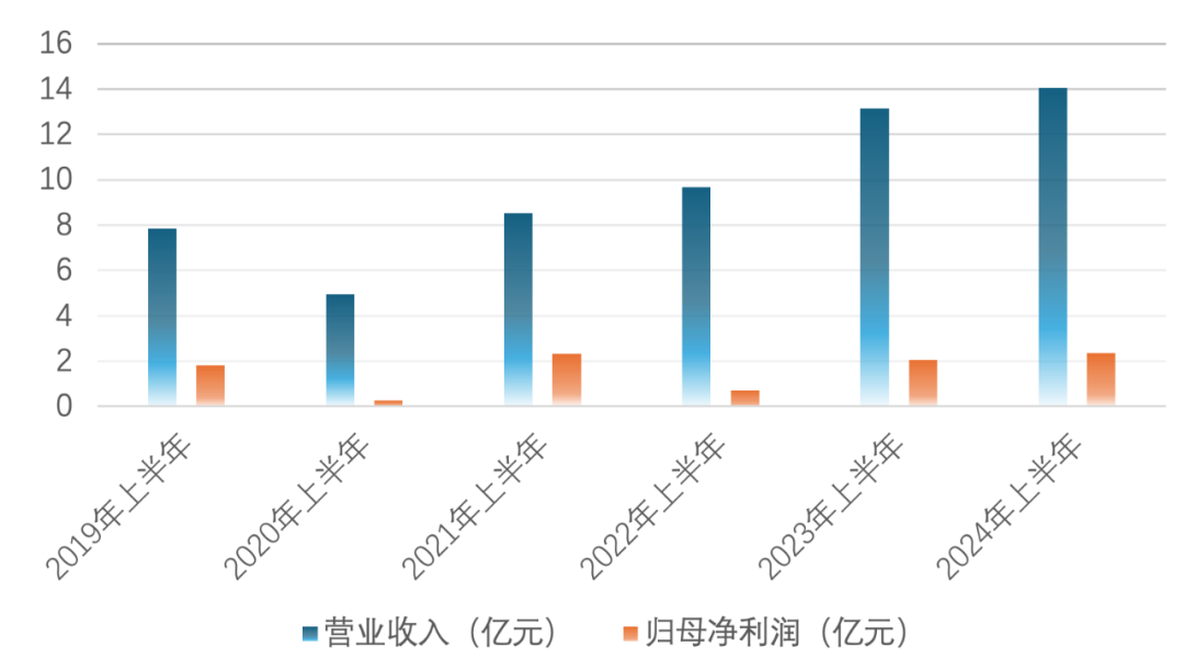 2024年上半年,公司实现营收与净利的双增长。其中,营业收入稳步增长6.97%至14.04亿元,归母净利润也同比增长14.64%至2.35亿元。然而,在这份看似亮眼、稳定的数据背后,却透露出昊海生科增长动能放缓的信号。与去年同期相比,该公司营收和归母净利润同比增速分别从35.66%、188.94%的高位显著回落。