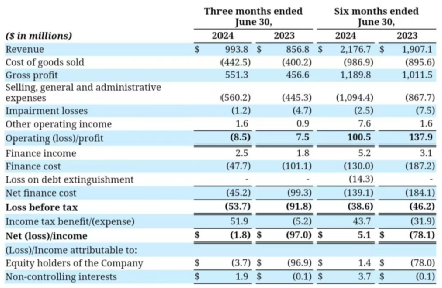 始祖鸟母公司亚玛芬体育(AS.N)披露的2024年第二季度财报显示。该季度,公司收入同比增长16%至9.94亿美元;净亏损180万美元,亏损同比收窄98%。上半年,公司实现收入21.77亿美元,同比增长14.1%;净利润扭亏为盈、约为510万美元,上年同期为-0.78亿美元。