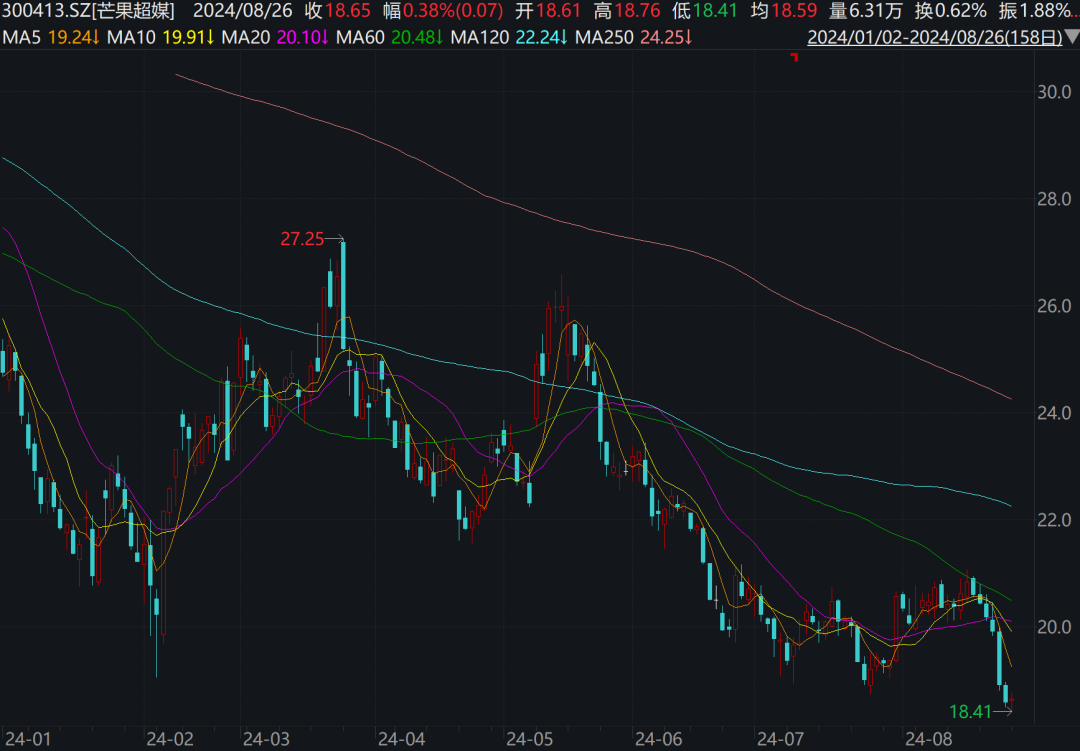 半年报发布次日,芒果超媒股价大跌,盘中最低跌幅为5.53%,至18.80元/股(不复权,下同)。在此之前,该公司股价已连续4个交易日收跌。截至8月26日,芒果超媒报于18.65元/股,近6个交易日累计跌幅10%,当前总市值为349亿元。