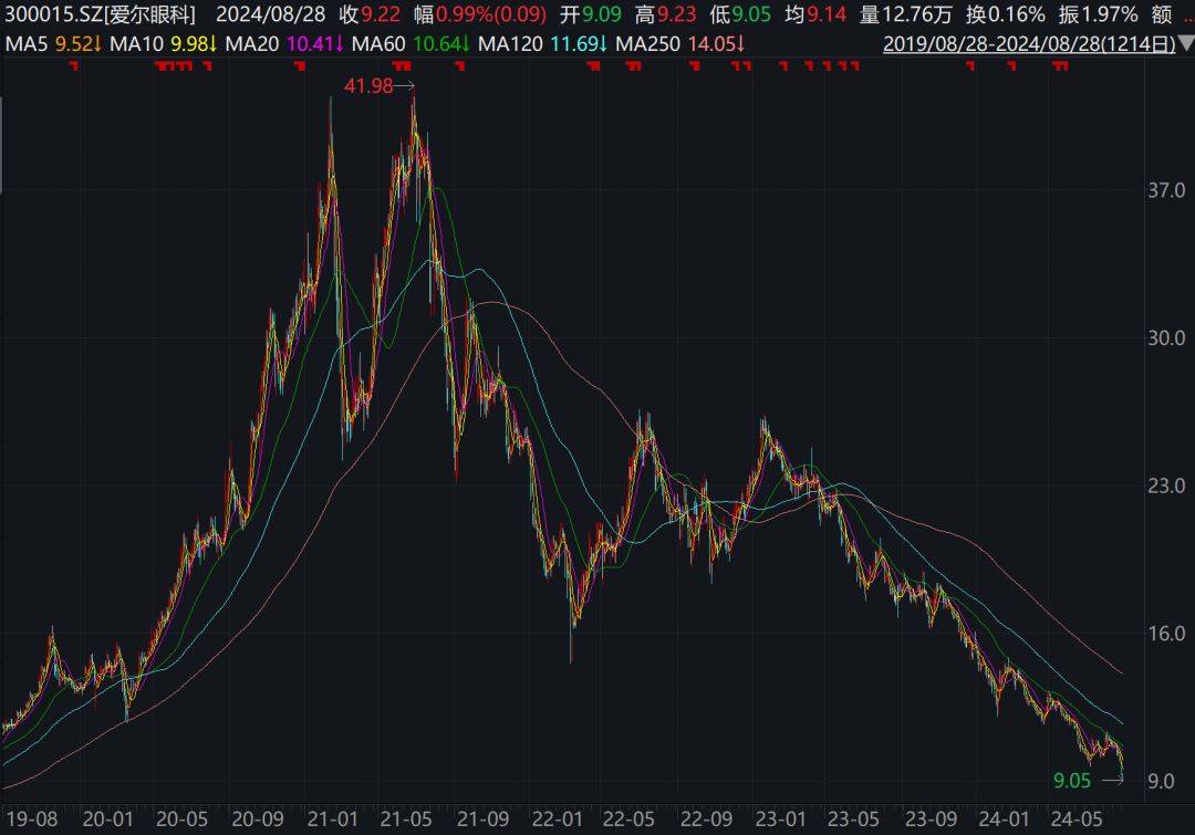 8月26日开盘,爱尔眼科医院集团股份有限公司(下称爱尔眼科,300015.SZ)股价急跌,当日跌幅达6.02%,收报9.36元/股。次日,公司股价继续走低,收报9.13元/股,跌幅为2.46%,并触及近五年新低。