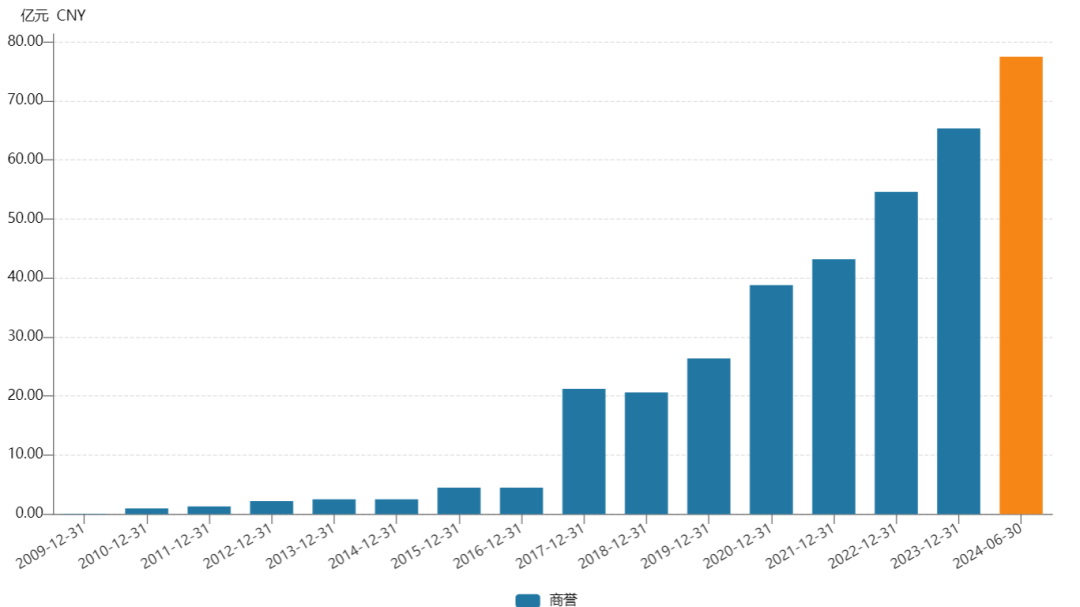 自2009年上市至2023年,爱尔眼科的商誉在14年时间里暴增1420倍。根据半年报,截至今年二季度末公司商誉已达到77.49亿元,占净资产的37.65%,超过了市场普遍接受的30%的界限,被认定为存在较大商誉风险。