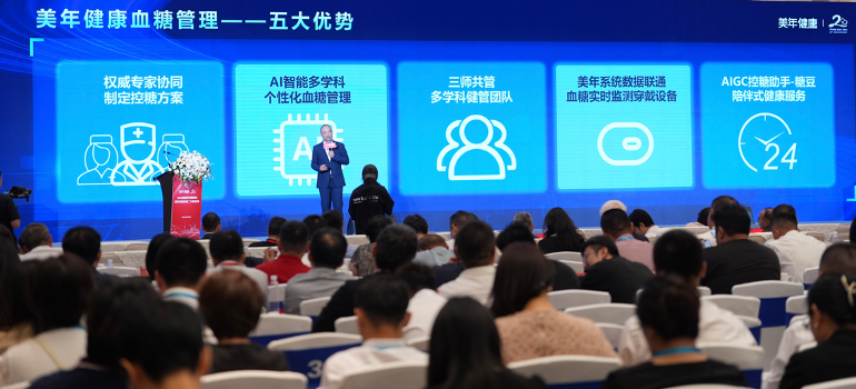 特别值得一提的是,该产品的AI智能控糖助理"糖豆",不仅运用先进的系统软件智能和AI技术提供动态血糖监测,而且能结合功能营养素的科学调配,从用药指导、饮食调整、运动建议等方面为每位用户定制"一人一策"的个性化血糖管理方案。该产品具备五大优势:第一、权威专家协同制定控糖方案;第二、AI智能多学科个性化血糖管理;第三,“三师共管”(医师、营养师、运动指导师),多学科健管团队;第四、美年系统数据联通血糖实时监测穿戴设备;第五、AIGC控糖助手陪伴式健康服务。这种全天候24小时的陪伴式服务,不仅关注糖尿病患者的血糖控制,更重视糖前干预,即在血糖水平尚未达到糖尿病诊断标准时,就通过早期干预,帮助用户控制血糖,预防糖尿病的发生和发展。