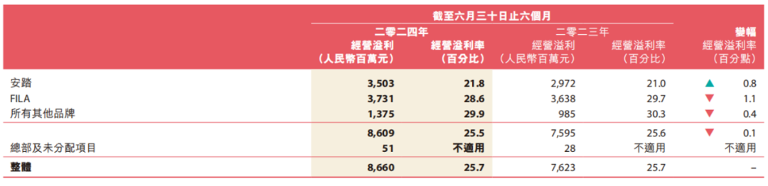 报告期内,FILA毛利率有所提升,经营溢利率则下滑至28.6%,走低原因主要是“本财政期内有较多国际跨界合作,为深化品牌形象而产生较多广告及宣传开支,导致经营开支占收入比率上升”;主品牌安踏上述“两率”均改善0.8个百分点。