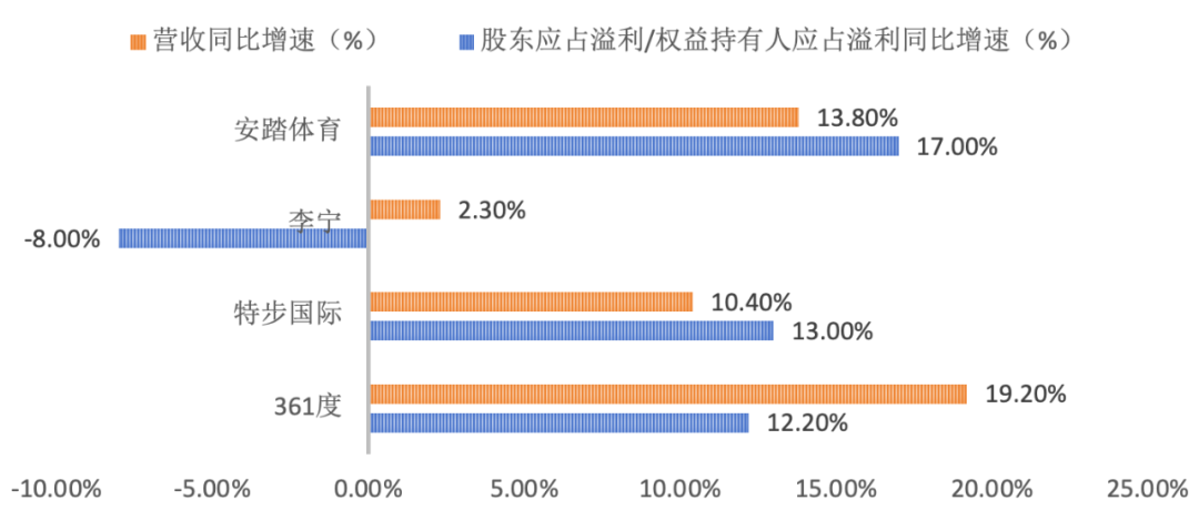 上半年李宁营收增长2.3%至143.45亿元,归母净利润同比下滑8.0%至19.52亿元,净利率有所走低。特步国际营收利润双增至72.03亿元、逾7亿元,同比增速均为低双位数,归母净利率微增。361度营收实现51.41亿元,溢利实现7.90亿元,增速均为两位数。