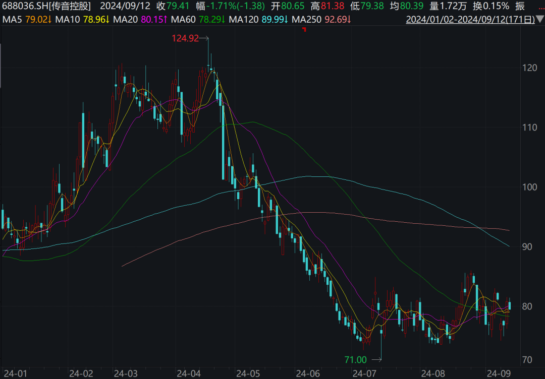 对此,资本市场持谨慎态度。自2024年4月下旬以来,传音控股的股价经历又一轮显著下跌,并在7月至9月上旬期间持续徘徊在较低水平。