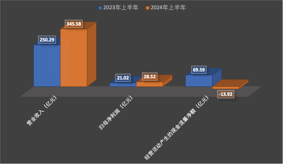 进入2023年,公司现金流情况得到大幅改善,但时至2024年上半年,在营收、净利润双增长情况下,公司现金流状况仍急转直下,当期经营活动产生的现金流量净额较上年同期骤降120%,由正转负,为-13.92亿元。