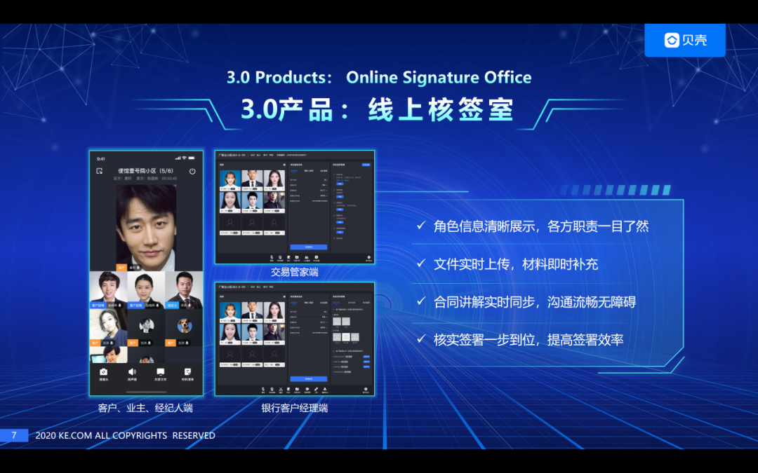 2020年3月,贝壳二手房屋买卖线上签约产品正式上线,这是一款服务于签约场景下的智能系统。两个月后,贝壳线上核签室上线,贝壳联合多家主流合作银行,打通贝壳交易系统与银行个贷系统,进行线上贷款核签,通过人脸识别和CFCA电子证书与意愿确认技术,实现贷款面签到审批的线上化办理。